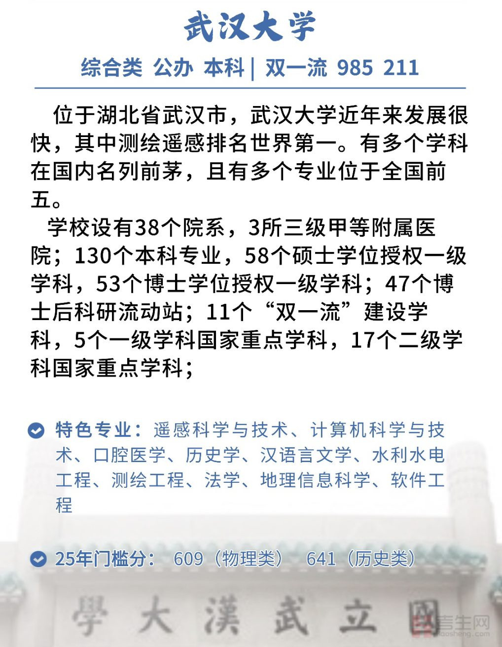 武汉大学是教育部直属重点综合性大学,是国家“985工程”和“211工程”重点建设高校,是首批“双一流”建设高校。