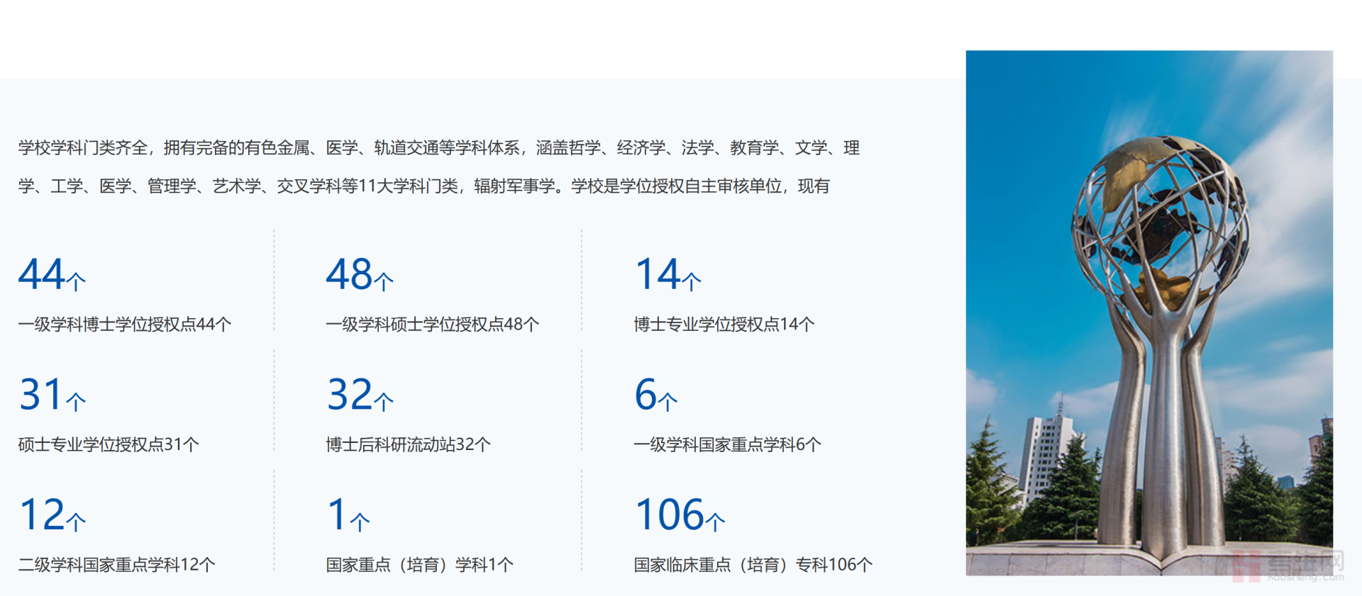 数学、材料科学与工程、冶金工程、矿业工程、交通运输工程5个学科入选国家“双一流”建设学科;材料科学、工程学、临床医学、计算机科学、化学、药理学与毒理学、生物学与生物化学、神经科学与行为学、数学、分子生物学与遗传学、社会科学总论、免疫学、精神病学与心理学、地球科学、环境科学与生态学、农业科学、物理学、微生物学、经济学与商学等19个学科进入基本科学指标全球前百分之一,其中材料科学、工程学、临床医学、计算机科学、化学、药理学与毒理学、环境科学与生态学、生物学与生物化学、分子生物学与遗传学居全球前千分之一,材料科学、工程学进入全球前万分之一。