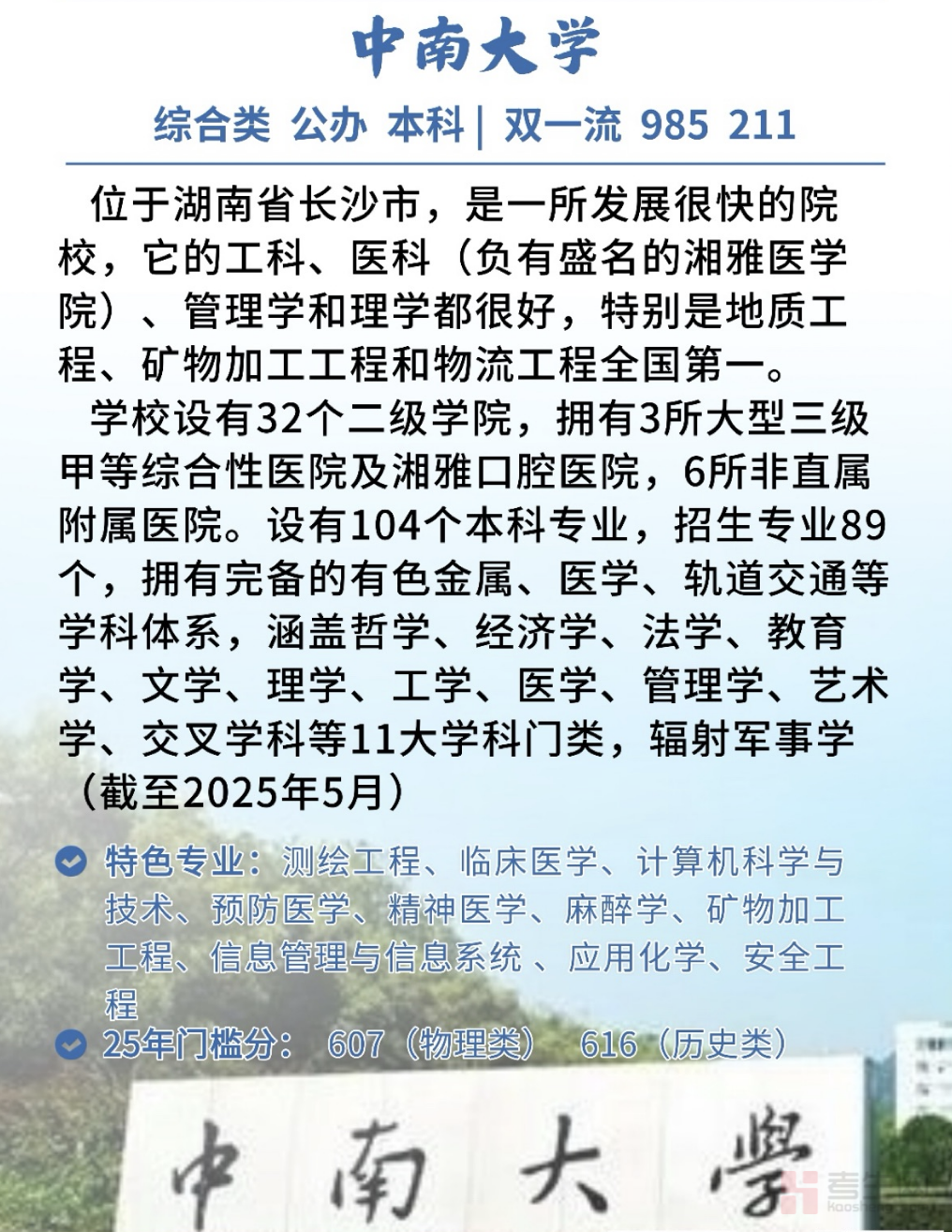 跨湘江两岸,依巍巍岳麓,临滔滔湘水,环境幽雅,景色宜人,是求知治学的理想园地。学校设有33个二级学院,拥有享“南湘雅”美誉的湘雅医院、湘雅二医院、湘雅三医院3所大型三级甲等综合性医院及湘雅口腔医院,和湘雅医学院附属海口医院、附属肿瘤医院、附属儿童医院、附属长沙医院、附属株洲医院、附属常德医院6所非直属附属医院。