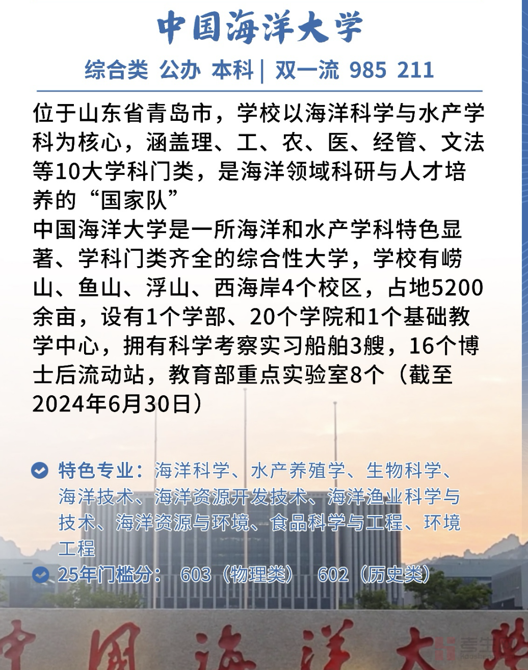 中国海洋大学(OCEAN UNIVERSITY OF CHINA),简称中国海大(OUC),是一所学科门类齐全、海洋和水产学科特色显著的教育部直属重点综合性大学,是国家“211工程”“985工程”和“双一流”重点建设高校。